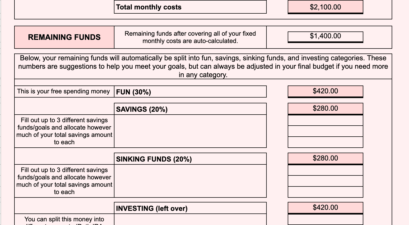 After you put in all your necessary expenses (total monthly costs) - all your remaining funds will be automatically split into the buckets you see. You can then follow this exactly, or make adjustments to help it match your goals better. For example, you may not be focused on investing post-tax (just investing in your 401k pre-tax), so maybe you choose to only invest $100 a month and split the rest between your savings and fun money.